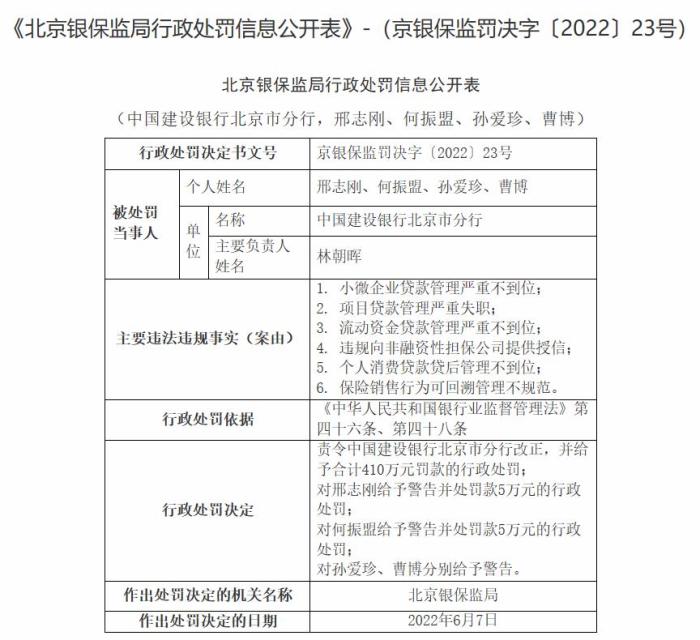 近日,中國銀行保險監(jiān)督管理委員會網(wǎng)站顯示,中國建設銀行北京分行因小微企業(yè)貸款管理嚴重不到位、項目貸款管理嚴重失職、流動資金貸款管理嚴重不到位、違規(guī)向非融資性擔保公司提供授信、個人消費貸款貸后管理不到位、保險銷售行為可回溯管理不規(guī)范等,被北京銀保監(jiān)局責令改正,并罰款410萬元,給予邢志剛警告并處罰款5萬元、給予何振盟警告并處罰款5萬元的行政處罰,并對孫愛珍、曹博給予?警告。