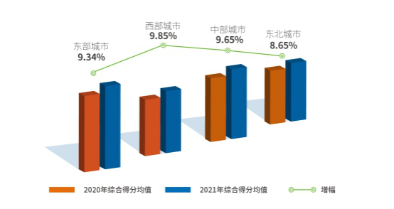 西部各參評城市2021年綜合得分均值比上次評估提升9.85%,在各區(qū)域中提升最快,區(qū)域內(nèi)各城市發(fā)展環(huán)境水平差距略有縮小。成都、西安等城市緊扣區(qū)域戰(zhàn)略發(fā)展機遇期、推動產(chǎn)業(yè)轉(zhuǎn)型升級,中小企業(yè)發(fā)展環(huán)境持續(xù)優(yōu)化,與東、中部領(lǐng)先城市差距縮小,對西部其他城市起到一定的引領(lǐng)示范作用;東北地區(qū)各參評城市綜合得分均值比上次評估提升8.65%,增長率在四個區(qū)域中最低。受地區(qū)經(jīng)濟增長長期乏力、產(chǎn)業(yè)結(jié)構(gòu)偏老偏重、人口持續(xù)流出等因素影響,東北城市中小企業(yè)發(fā)展較慢,發(fā)展環(huán)境整體改善勢頭不及其他地區(qū),還需要綜合施策、持續(xù)發(fā)力。