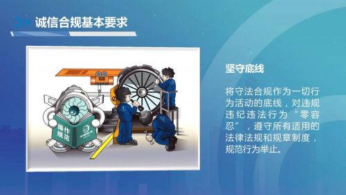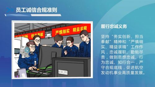 誠信鑄心,合規(guī)立行。中國航發(fā)深入貫徹習(xí)近平法治思想,落實(shí)全面依法治國戰(zhàn)略,始終堅(jiān)持誠信合規(guī)經(jīng)營,以誠信涵養(yǎng)健康產(chǎn)業(yè)生態(tài),以合規(guī)凝聚磅礴發(fā)展動(dòng)力,推動(dòng)航空發(fā)動(dòng)機(jī)事業(yè)高質(zhì)量發(fā)展?!吨袊桨l(fā)誠信合規(guī)準(zhǔn)則》(以下簡稱《準(zhǔn)則》)作為集團(tuán)合規(guī)管理頂層規(guī)范,為全集團(tuán)誠信合規(guī)經(jīng)營提供了基本的行動(dòng)指南,對于打造誠信合規(guī)文化、不斷提升集團(tuán)誠信合規(guī)經(jīng)營管理水平具有重要意義。