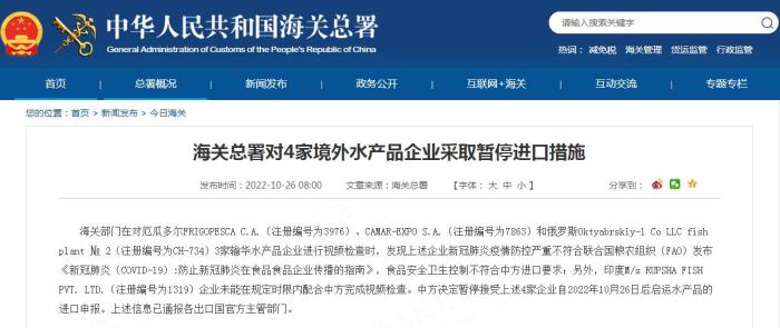 海關(guān)總署網(wǎng)站10月26日消息,海關(guān)部門在對厄瓜多爾FRIGOPESCA C.A.(注冊編號為3976)、CAMAR-EXPO S.A.(注冊編號為7863)和俄羅斯Oktyabrskiy-1 Co LLC fish plant № 2(注冊編號為CH-734)3家輸華水產(chǎn)品企業(yè)進(jìn)行視頻檢查時(shí),發(fā)現(xiàn)上述企業(yè)新冠肺炎疫情防控嚴(yán)重不符合聯(lián)合國糧農(nóng)組織(FAO)發(fā)布《新冠肺炎(COVID-19):防止新冠肺炎在食品食品企業(yè)傳播的指南》,食品安全衛(wèi)生控制不符合中方進(jìn)口要求;另外,印度M/s RUPSHA FISH PVT. LTD.(注冊編號為1319)企業(yè)未能在規(guī)定時(shí)限內(nèi)配合中方完成視頻檢查。中方?jīng)Q定暫停接受上述4家企業(yè)自2022年10月26日后啟運(yùn)水產(chǎn)品的進(jìn)口申報(bào)。上述信息已通報(bào)各出口國官方主管部門。(汪定強(qiáng))