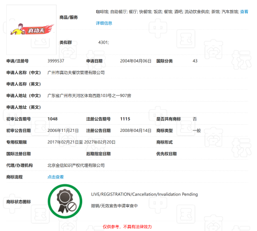 以“真功夫及圖”(注冊(cè)號(hào):3999537)為例,中國(guó)商標(biāo)網(wǎng)顯示,該商標(biāo)為真功夫于2004年申請(qǐng)注冊(cè)的第43類“餐廳”等服務(wù)商標(biāo),專用權(quán)期限原為2017年2月21日至2027年2月20日。