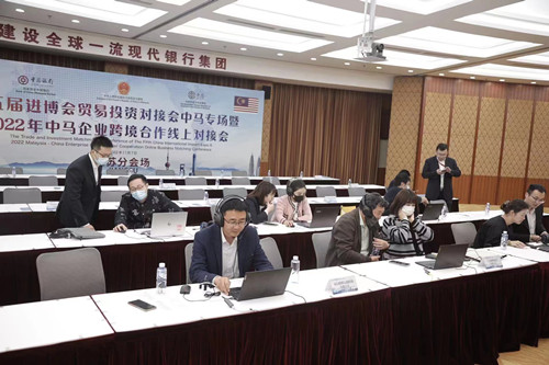 為進(jìn)一步豐富第五屆進(jìn)博會(huì)對(duì)接活動(dòng)主題,促進(jìn)中國(guó)和馬來(lái)西亞兩國(guó)間的經(jīng)貿(mào)投資往來(lái),中國(guó)銀行與中國(guó)駐馬來(lái)西亞大使館、馬來(lái)西亞中華總商會(huì)共同舉辦了“第五屆進(jìn)博會(huì)貿(mào)易投資對(duì)接會(huì)中馬專(zhuān)場(chǎng)暨2022年中馬企業(yè)跨境撮合線上對(duì)接會(huì)”(以下簡(jiǎn)稱(chēng)“中馬對(duì)接會(huì)”),邀請(qǐng)客戶(hù)依托“惠如愿·中銀e企贏”平臺(tái)開(kāi)展線上視頻洽談。江蘇中行積極落實(shí)總行工作部署,設(shè)立了南京、淮安兩處分會(huì)場(chǎng),邀約了近30家中小企業(yè)客戶(hù)參加“中馬對(duì)接會(huì)”。