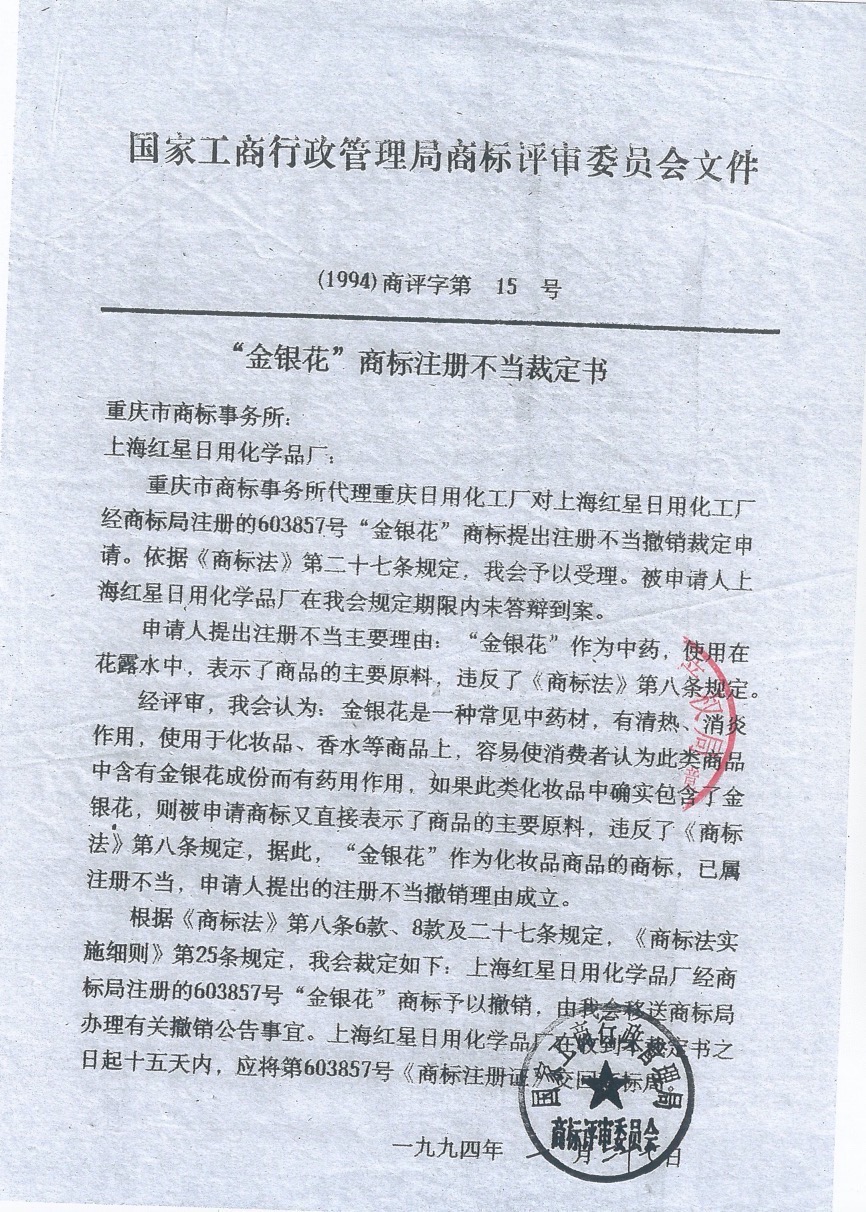 申請人詩妍公司向法庭展示了(1994)商評字第15號“金銀花”商標(biāo)注冊不當(dāng)裁定書。這份裁定書載明,重慶日用化工廠對上海紅星日用化工廠(金銀花商標(biāo)的注冊人)提出了商標(biāo)注冊不當(dāng)撤銷申請,當(dāng)時的國家工商行政管理局商標(biāo)評審委員會作出裁定:對該商標(biāo)予以撤銷。