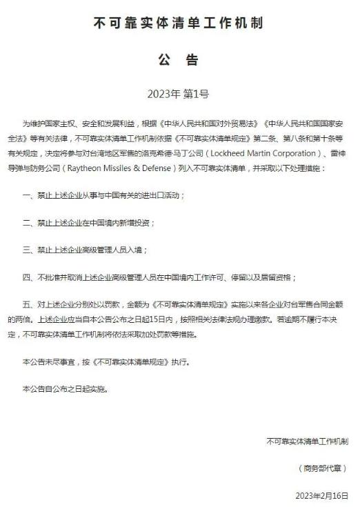 據(jù)商務(wù)部官網(wǎng)消息,2月16日,不可靠實體清單工作機制發(fā)布2023年第1號公告,決定將洛克希德·馬丁公司、雷神導(dǎo)彈與防務(wù)公司列入不可靠實體清單。