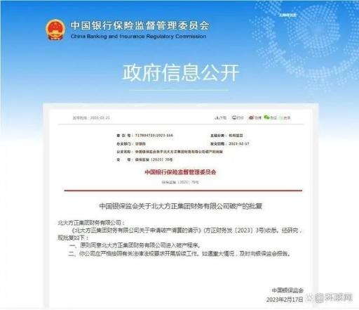 中國銀保監(jiān)會關(guān)于北大方正集團財務(wù)有限公司破產(chǎn)的批復(fù)