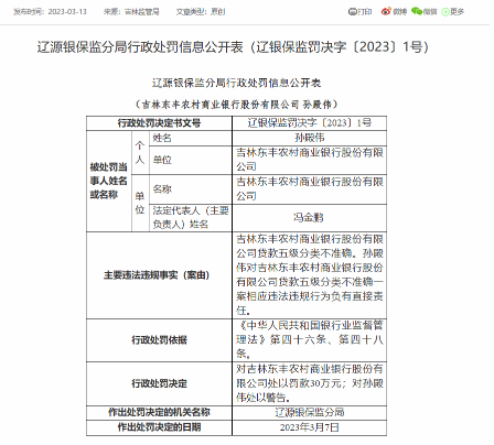中國網(wǎng)財(cái)經(jīng)3月13日訊 今日,銀保監(jiān)會網(wǎng)站顯示,吉林東豐農(nóng)村商業(yè)銀行因貸款五級分類不準(zhǔn)確,被遼源銀保監(jiān)分局罰款30萬元。