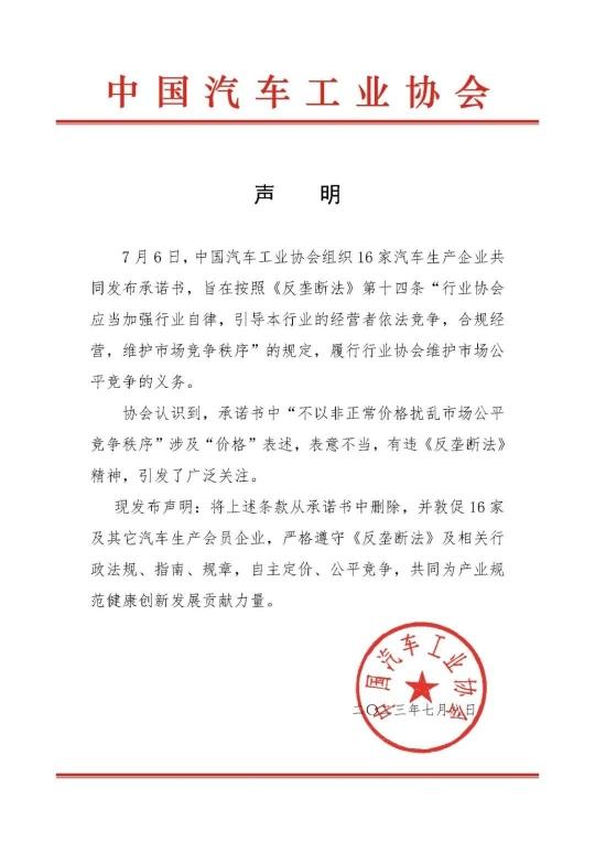 中國汽車工業(yè)協(xié)會表示,現(xiàn)發(fā)布聲明:將上述條款從承諾書中刪除,并敦促16家及其它汽車生產(chǎn)會員企業(yè),嚴格遵守《反壟斷法》及相關行政法規(guī)、指南、規(guī)章,自主定價、公平競爭,共同為產(chǎn)業(yè)規(guī)范健康創(chuàng)新發(fā)展貢獻力量。