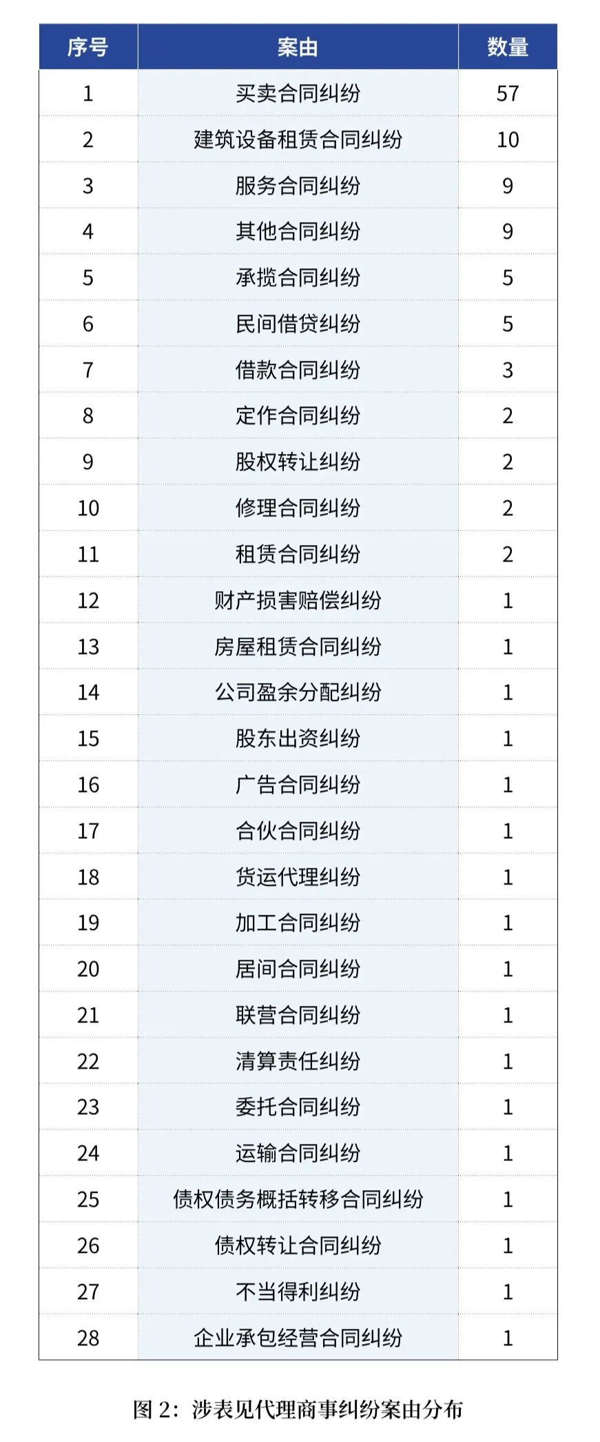 2019年至2022年審結(jié)的涉表見(jiàn)代理商事糾紛案件共涉及28個(gè)案由,其中買(mǎi)賣(mài)合同糾紛案件為57件,占比46.34%,接近總數(shù)量的一半;建筑設(shè)備租賃合同糾紛案件為10件,占比8.13%;服務(wù)合同糾紛案件、其他合同糾紛案件各為9件,分別占比7.32%,此四類(lèi)合同,分別占結(jié)案數(shù)的前三位。(如圖2)