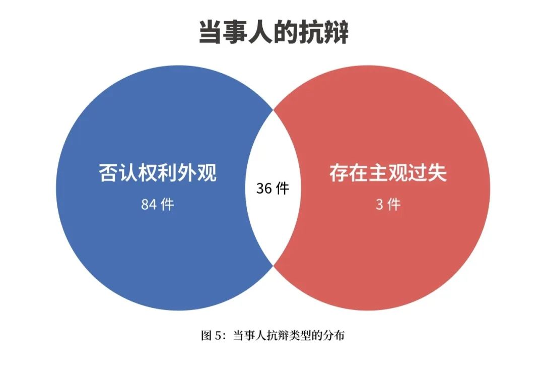 123件涉表見(jiàn)代理商事合同糾紛案件中,有84件抗辯否認(rèn)權(quán)利外觀存在,有3件抗辯相對(duì)人主觀上存在過(guò)失,有36件抗辯既否認(rèn)權(quán)利外觀存在,又認(rèn)為相對(duì)人主觀上存在過(guò)失。(如圖5)