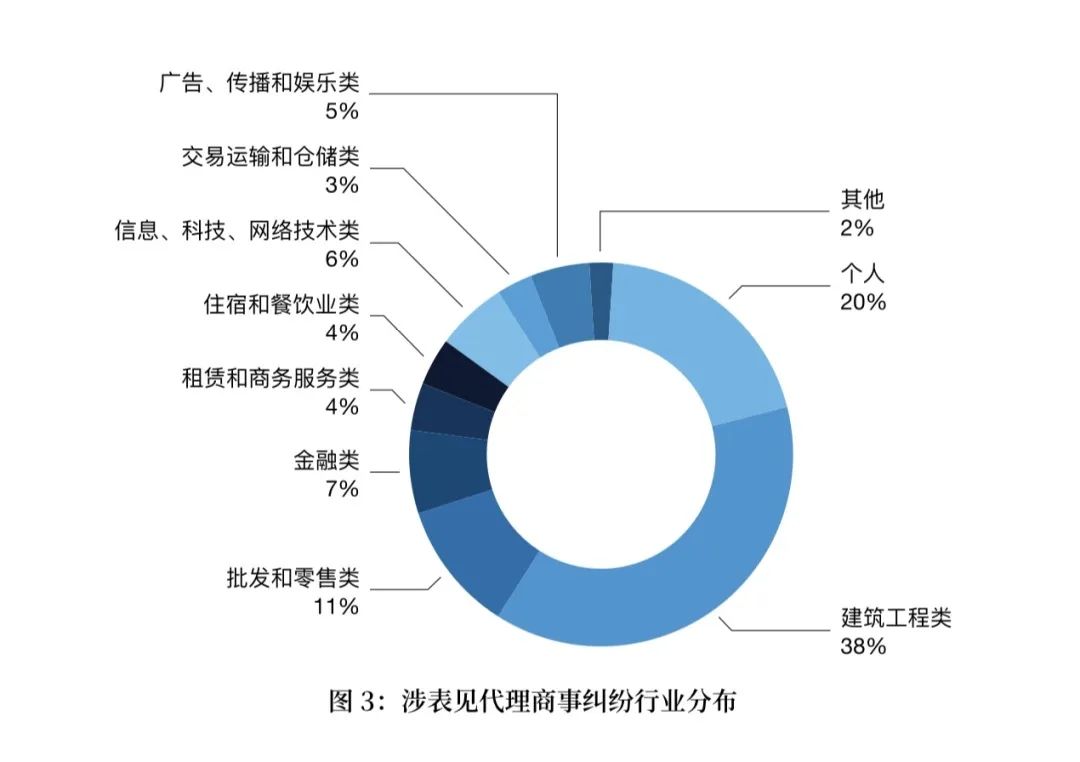 123件涉表見(jiàn)代理商事糾紛案件中,涉訴主體共有327名,其中公司為260家,占79.51%,個(gè)人為67人,占20.49%。在260家公司中,根據(jù)行業(yè)分類(lèi),建筑工程類(lèi)有125家,批發(fā)和零售類(lèi)有36家,金融類(lèi)有22家,信息、科技、網(wǎng)絡(luò)技術(shù)類(lèi)有19家,住宿和餐飲業(yè)有22家,信息傳輸、信息技術(shù)服務(wù)業(yè)有18家,租賃和商務(wù)服務(wù)有14家,建筑業(yè)有12家,交通運(yùn)輸、倉(cāng)儲(chǔ)業(yè)有9家,娛樂(lè)業(yè)有6家,其他行業(yè)有6家。(如圖3)