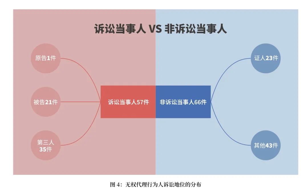 123件涉表見(jiàn)代理商事糾紛案件中,有57件將行為人列為訴訟當(dāng)事人,有66件未將行為人列為訴訟當(dāng)事人。在57件將行為人列為當(dāng)事人的案件中,行為人訴訟地位為原告的有1件,訴訟地位為被告的有21件,訴訟地位為第三人的有35件。在66件未將行為人列為當(dāng)事人的案件中,行為人作為證人出庭作證的有23件。(如圖4)