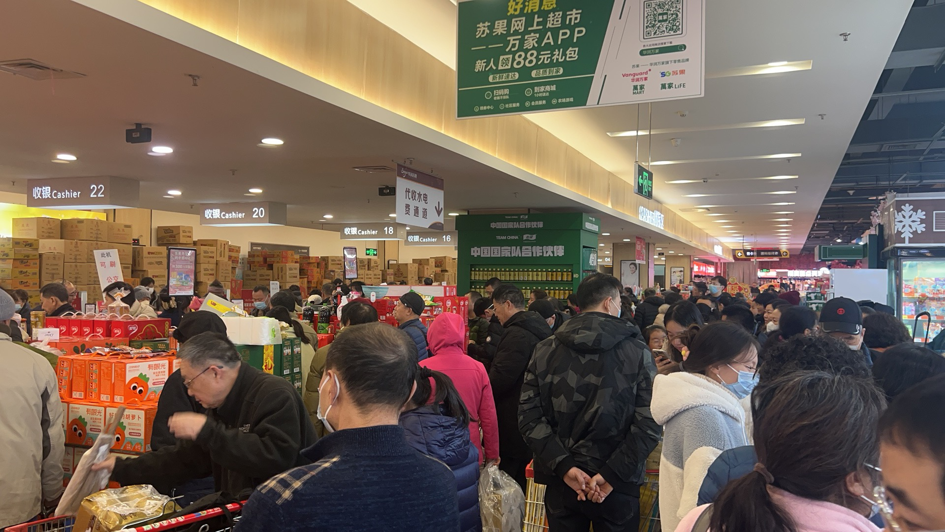 元旦期間,南京市鼓樓區(qū)一家大型蘇果門店,豐富的商品、給力的折扣,年節(jié)氛圍十分濃郁。消費者手推購物車在貨架前選購心儀的商品,同時也把“美好生活”的向往裝進了購物車。