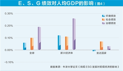 一是促進(jìn)經(jīng)濟(jì)增長(zhǎng)。牛津大學(xué)的學(xué)者研究結(jié)果顯示,一國(guó)企業(yè)的ESG表現(xiàn)與該國(guó)人均GDP具有正向關(guān)系,環(huán)境、社會(huì)和治理因素評(píng)分每上升1個(gè)單位,將推動(dòng)人均GDP分別上升0.06%、0.1%和0.19%,其中在發(fā)達(dá)和新興經(jīng)濟(jì)體中,企業(yè)社會(huì)績(jī)效對(duì)人均GDP的增長(zhǎng)都有顯著的積極影響,而環(huán)境和公司治理因素只對(duì)新興經(jīng)濟(jì)體具有積極的影響,對(duì)發(fā)達(dá)國(guó)家的影響不顯著(圖4)。