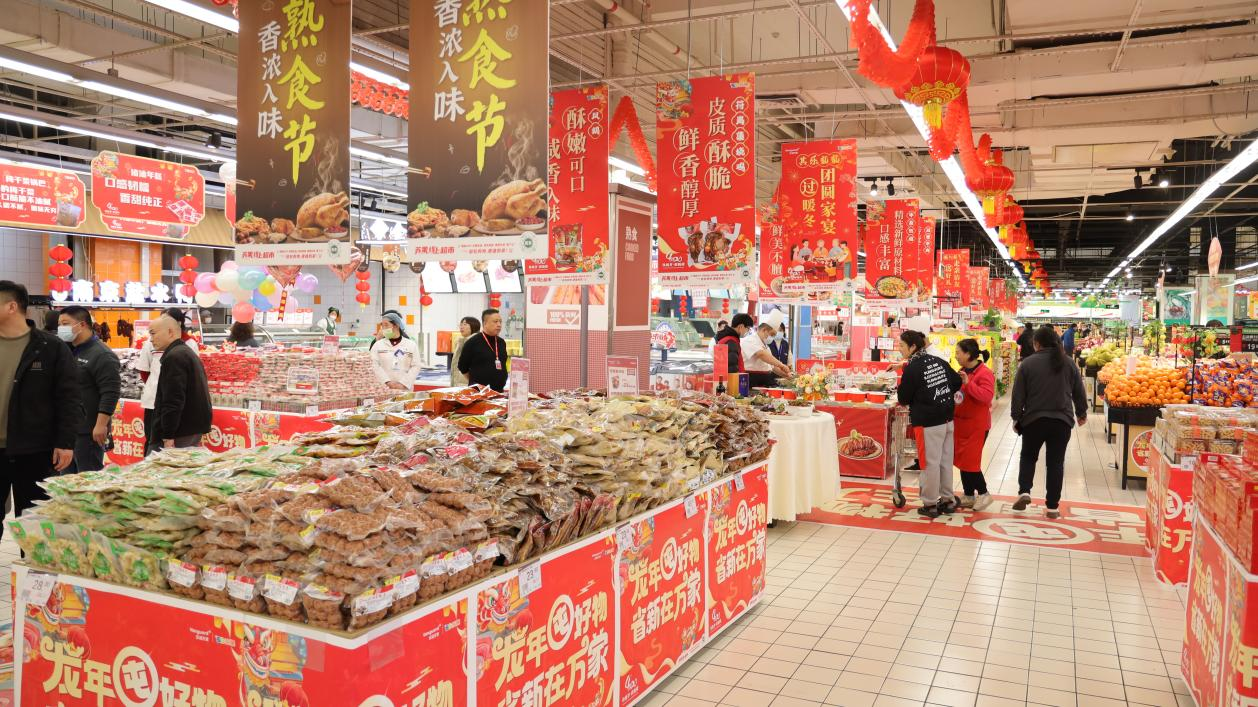 在蘇果南京將軍大道店,喜氣洋洋的龍年年貨節(jié)海報、吊旗裝飾了整個賣場,各式休閑食品、酒水、牛奶酒水禮盒,鮮活的水產、新鮮的果蔬、來自全國各地的土特產、龍年飾品、吉祥物等琳瑯滿目,蘇果超市“年貨節(jié)”呈現(xiàn)一片紅火和欣欣向榮的熱鬧景象。不少消費者推著購物車提前選購心儀的年貨和伴手禮?!懊磕甑倪@個時候家里都會提前備年貨和福字紅包等年節(jié)商品,錯開節(jié)前一周的購買高峰?!笔忻裰馨⒁瘫硎尽?/p>
