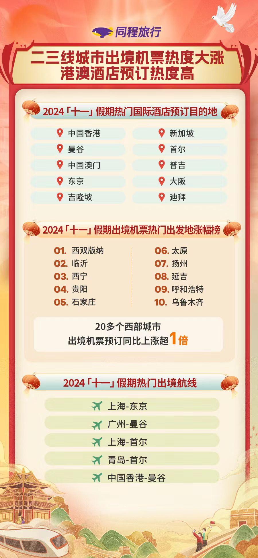 在客源地方面,國(guó)內(nèi)二三線城市居民特別是西部各省區(qū)市居民出境游需求快速增長(zhǎng)。同程旅行數(shù)據(jù)顯示,今年“十一”假期出境游機(jī)票出發(fā)地中,西雙版納、臨沂、西寧、貴陽、石家莊等城市出境航班預(yù)訂熱度漲幅最高。有20多個(gè)西部城市出境機(jī)票預(yù)訂同比漲幅超過1倍。