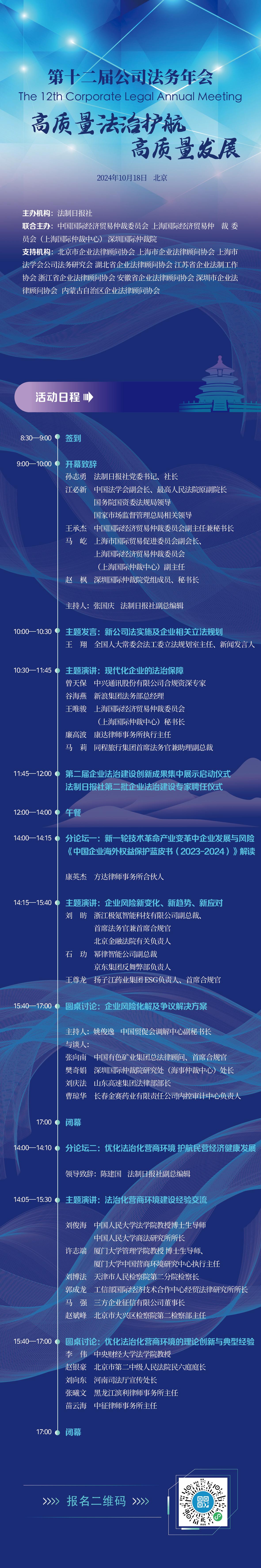 2024年是實現(xiàn)“十四五”規(guī)劃目標(biāo)任務(wù)的關(guān)鍵一年。面對新一輪科技革命和產(chǎn)業(yè)變革,企業(yè)在迎來發(fā)展新機遇的同時,也面臨著數(shù)據(jù)安全治理、知識產(chǎn)權(quán)保護(hù)、反壟斷、出口管制、經(jīng)濟(jì)制裁等諸多法律風(fēng)險和挑戰(zhàn)。為此,法制日報社將舉辦“第十二屆公司法務(wù)年會(北京)”活動,旨在共同探尋企業(yè)在法治軌道上實現(xiàn)高質(zhì)量發(fā)展的路徑和策略,推動企業(yè)在以中國式現(xiàn)代化全面推進(jìn)強國建設(shè)、民族復(fù)興偉業(yè)中作出更大貢獻(xiàn)。