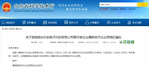 《通知》內(nèi)容顯示,根據(jù)《高新技術(shù)企業(yè)認定管理辦法》(國科發(fā)火〔2016〕32號)和《高新技術(shù)企業(yè)認定管理工作指引》(國科發(fā)火〔2016〕195號)有關(guān)規(guī)定,經(jīng)研究,決定撤銷煙臺引航電子科技有限公司等85家企業(yè)的高新技術(shù)企業(yè)資格。山東萊鋼永鋒鋼鐵有限公司則列于名單第78位,證書編號GR202237007406,撤銷起始年份為2023年。