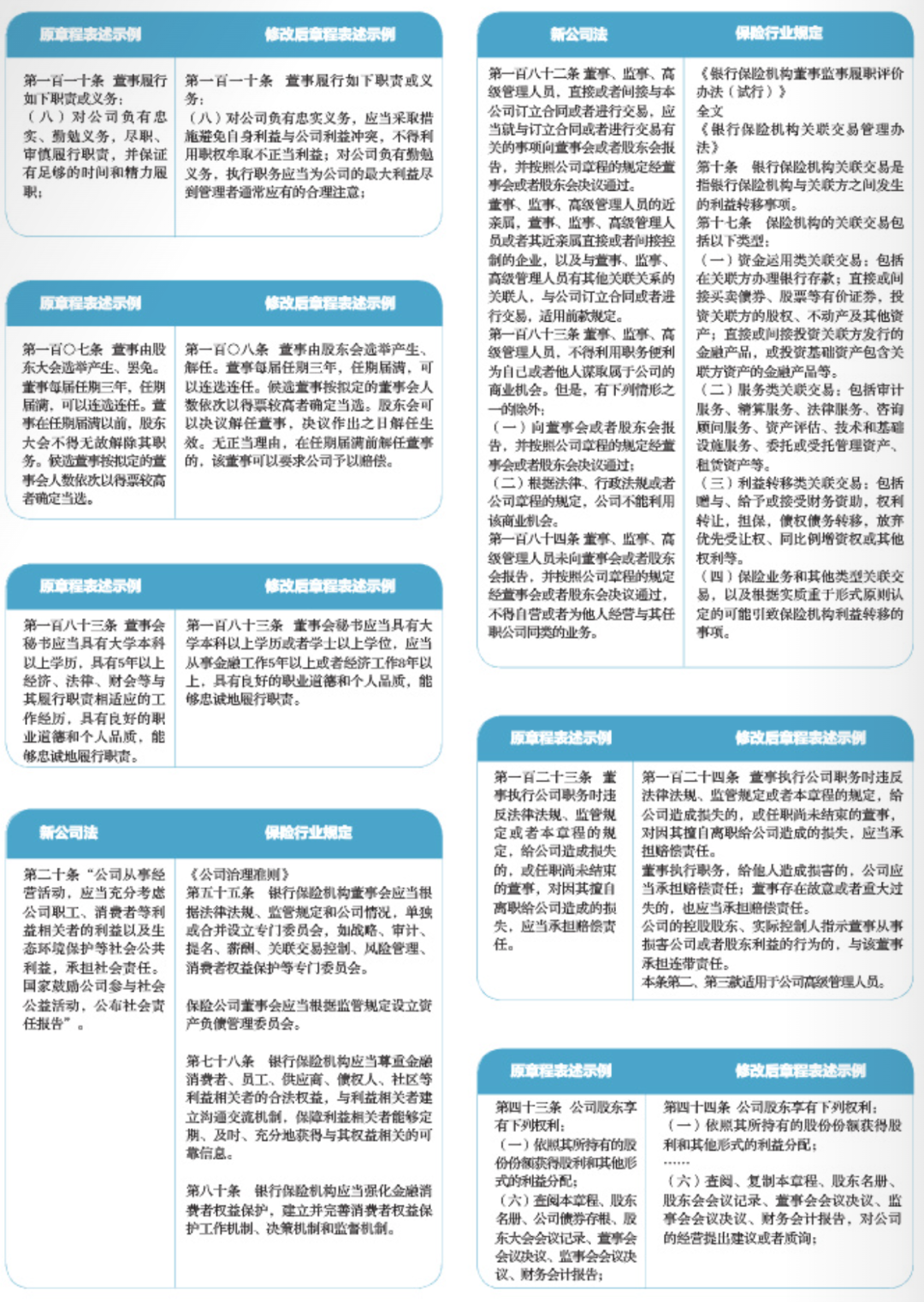 新公司法對保險(xiǎn)公司治理架構(gòu)產(chǎn)生了多方面的影響,加強(qiáng)了對控股股東和實(shí)際控制人的規(guī)范和對中小股東的保護(hù),此將有助于維護(hù)保險(xiǎn)市場的穩(wěn)定和公平,靈活簡化董事會和監(jiān)事會的設(shè)置安排,明確董、高、監(jiān)的忠實(shí)勤勉義務(wù),強(qiáng)化職工民主管理,有助于保險(xiǎn)機(jī)構(gòu)提升公司治理效率和水平,這些對于保險(xiǎn)公司修訂章程產(chǎn)生了重要影響。筆者認(rèn)為,需要根據(jù)新公司法的修訂內(nèi)容并考慮保險(xiǎn)監(jiān)管相關(guān)法規(guī)要求,相應(yīng)修訂公司章程的條款。