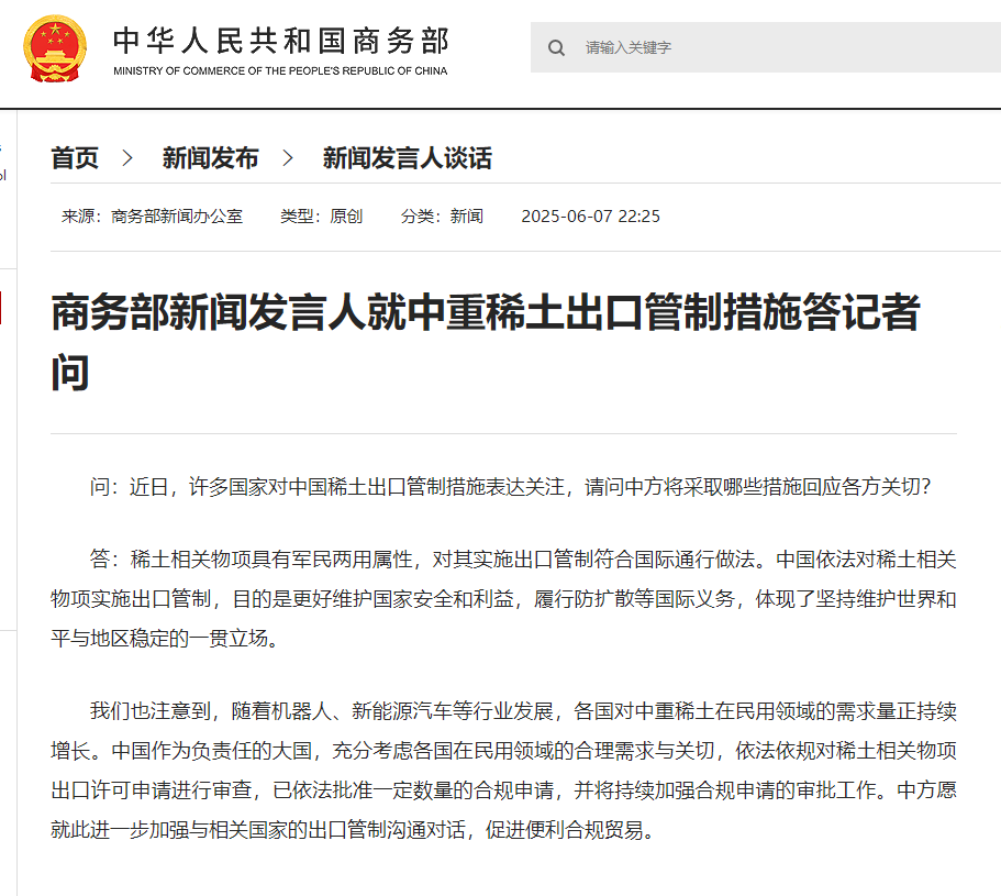 我們也注意到,隨著機器人、新能源汽車等行業(yè)發(fā)展,各國對中重稀土在民用領(lǐng)域的需求量正持續(xù)增長。中國作為負(fù)責(zé)任的大國,充分考慮各國在民用領(lǐng)域的合理需求與關(guān)切,依法依規(guī)對稀土相關(guān)物項出口許可申請進(jìn)行審查,已依法批準(zhǔn)一定數(shù)量的合規(guī)申請,并將持續(xù)加強合規(guī)申請的審批工作。中方愿就此進(jìn)一步加強與相關(guān)國家的出口管制溝通對話,促進(jìn)便利合規(guī)貿(mào)易。