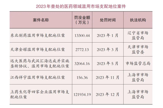 去年6月,根據(jù)市場(chǎng)監(jiān)管總局(國(guó)家反壟斷局)發(fā)布的《中國(guó)反壟斷執(zhí)法年度報(bào)告(2023)》,醫(yī)藥領(lǐng)域共查處濫用市場(chǎng)支配地位案件5件,罰沒金額合計(jì)17.02億元。其中4起都為原料藥市場(chǎng)壟斷,另外1起為短缺藥不公平高價(jià)行為壟斷調(diào)查案件。