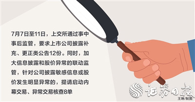 監(jiān)管部門(mén)加大事中事后監(jiān)管。比如,僅7月7日至11日期間,上交所就要求上市公司披露補(bǔ)充、更正類(lèi)公告12份。同時(shí),加大信息披露和股價(jià)異常的聯(lián)動(dòng)監(jiān)管,針對(duì)公司披露敏感信息或股價(jià)發(fā)生明顯異常的,提請(qǐng)啟動(dòng)內(nèi)幕交易、異常交易核查8單。