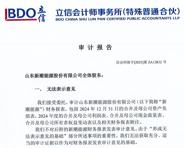 值得關(guān)注的是,因未能按時披露定期報告,*ST新潮股票自5月6日起停牌,并引發(fā)證監(jiān)會立案調(diào)查。在經(jīng)歷數(shù)月的加急審計后,立信會計師事務(wù)所7月5日完成了ST新潮2024年年報及2025年一季報的審計。然而,立信對財務(wù)報告和內(nèi)部控制均出具了“無法表示意見”的審計結(jié)論。
