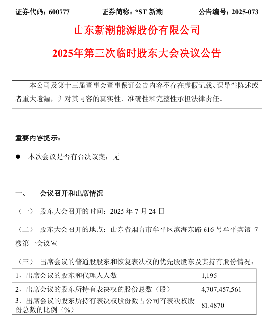 7月24日下午,*ST新潮臨時股東大會在山東煙臺牟平賓館召開。此次股東大會是在新晉第一大股東伊泰B股向現(xiàn)任董監(jiān)事會提出“提前換屆”訴求屢次遭拒后,由6位中小股東自行召集舉行的。這也是2025年A股上市公司中首例由中小股東自行召集的股東大會。