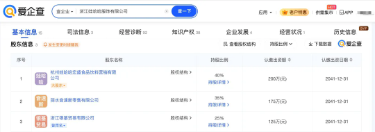 浙江娃哈哈服飾有限公司成立于2021年9月,法定代表人為鄭道哈,注冊資本500萬元人民幣,經(jīng)營范圍包括服裝服飾批發(fā)、服裝服飾零售、箱包銷售等,由杭州娃哈哈宏盛食品飲料營銷有限公司、麗水音速新零售有限公司、浙江銀基貿(mào)易有限公司分別持股40%、35%、25%。