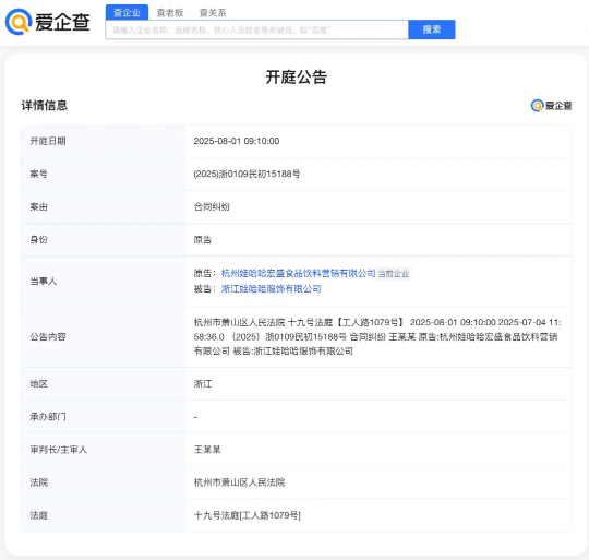 愛企查App顯示,近日,杭州娃哈哈宏盛食品飲料營銷有限公司與浙江娃哈哈服飾有限公司相關(guān)合同糾紛案件新增開庭公告,原告為杭州娃哈哈宏盛食品飲料營銷有限公司,該案件將于8月1日在杭州市蕭山區(qū)人民法院開庭審理。
