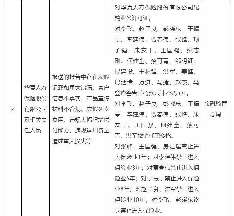 國家金融監(jiān)督管理總局網(wǎng)站8月1日發(fā)布的行政處罰信息公示列表顯示,華夏人壽保險(xiǎn)股份有限公司及相關(guān)責(zé)任人員報(bào)送的報(bào)告中存在虛假記載和重大遺漏、客戶信息不真實(shí)、產(chǎn)品宣傳材料不合規(guī)、虛假列支費(fèi)用、違規(guī)大幅虛增償付能力、違規(guī)運(yùn)用資金造成重大損失等。