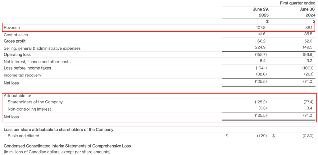 加拿大鵝是全球高性能奢華生活方式品牌,一家定位高端的羽絨服制造公司,創(chuàng)立于1957年。據(jù)加拿大鵝7月31日發(fā)布的截至2025年6月29日的2026財年第一財季財務(wù)業(yè)績顯示,第一財季實現(xiàn)營收1.078億美元,同比增長22.4%,按固定匯率計算增長21.5%;歸母凈虧損為-1.252億美元,去年同期為-0.774億美元,虧損同比擴大超六成。