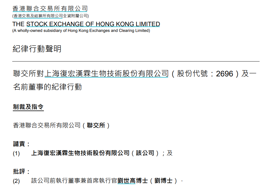 9月2日,復宏漢霖(2696.HK)公告了一份聯(lián)交所對公司及一名前董事的紀律行動聲明。文件顯示,復宏漢霖受到港交所譴責,而公司前執(zhí)行董事兼CEO劉世高受到批評。港交所要求劉世高接受26小時有關監(jiān)管和法律議題以及上市規(guī)則合規(guī)事宜的培訓,才能再獲委任為任何已于或?qū)⒂诼?lián)交所上市的公司董事。