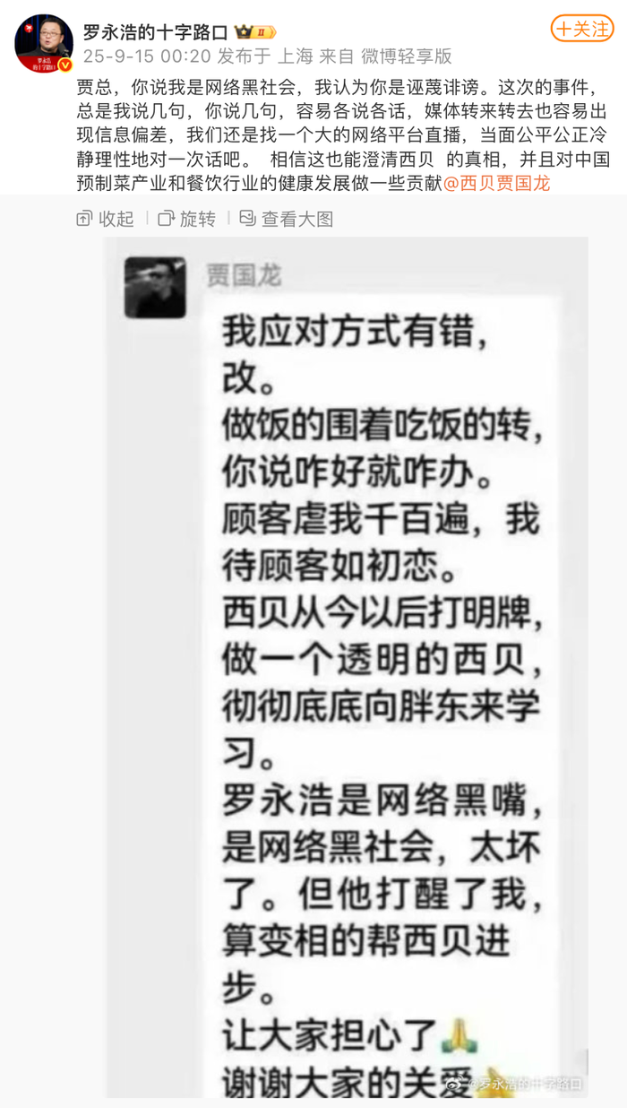 近日,西貝餐飲與羅永浩就預(yù)制菜引發(fā)的爭(zhēng)論在網(wǎng)絡(luò)上持續(xù)發(fā)酵。14日晚間,西貝創(chuàng)始人賈國(guó)龍此前表態(tài)的完整截圖流出,其中除了提到西貝從今以后要打明牌、向胖東來(lái)學(xué)習(xí)外,還將羅永浩稱為網(wǎng)絡(luò)黑嘴、網(wǎng)絡(luò)黑社會(huì)。對(duì)此,羅永浩今日凌晨在社交平臺(tái)表示,本次事件中雙方總是各說(shuō)各話,媒體轉(zhuǎn)來(lái)轉(zhuǎn)去也容易出現(xiàn)信息偏差。他提議,雙方找一個(gè)大型網(wǎng)絡(luò)平臺(tái)直播,當(dāng)面對(duì)話。