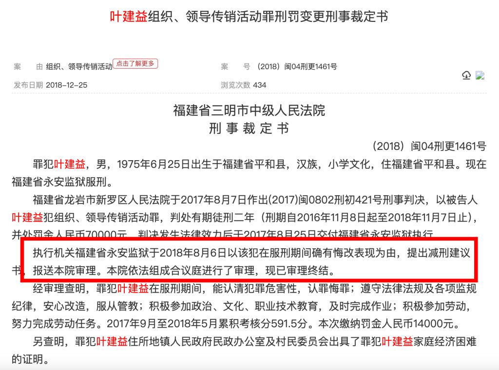 2018年12月,中國(guó)裁判文書(shū)網(wǎng)另披露過(guò)一份《葉建益組織、領(lǐng)導(dǎo)傳銷(xiāo)活動(dòng)罪刑罰變更刑事裁定書(shū)》,福建省三明市中級(jí)人民法院公開(kāi)的一份刑事裁定書(shū)顯示,執(zhí)行機(jī)關(guān)福建省永安監(jiān)獄于2018年8月6日以該犯在服刑期間確有悔改表現(xiàn)為由,提出減刑建議書(shū),報(bào)送本院審理。本院認(rèn)為,罪犯葉建益在服刑期間確有悔改表現(xiàn),符合減刑條件。裁定:對(duì)罪犯葉建益減去有期徒刑二個(gè)月,刑期自2016年11月8日起至2018年9月7日止。