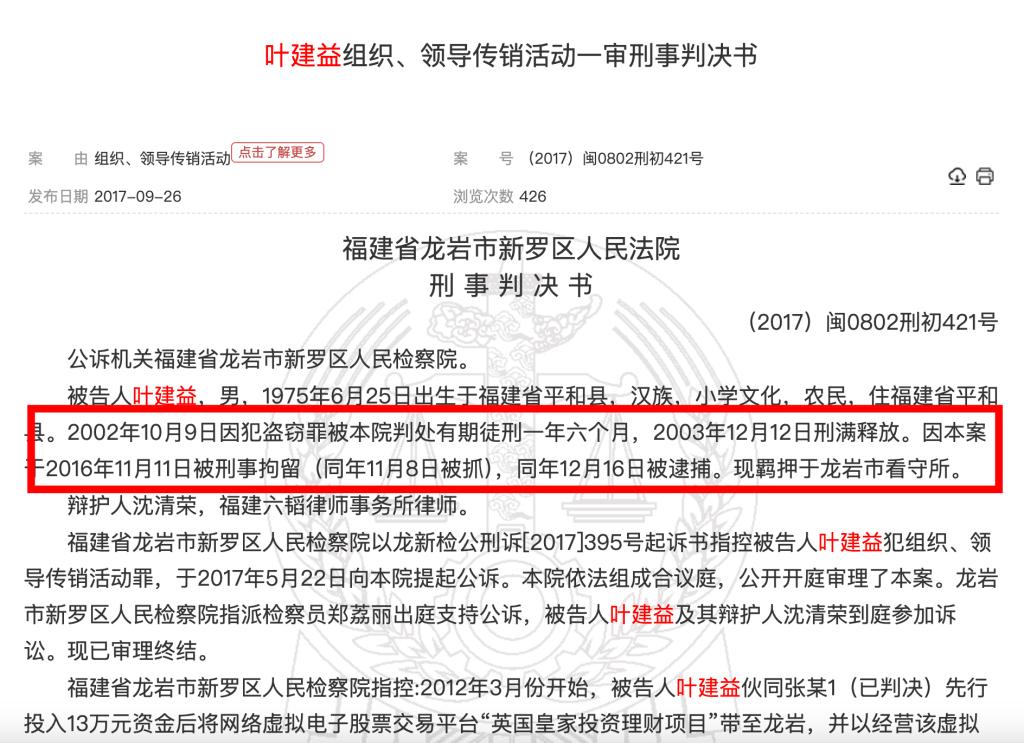 澎湃新聞根據(jù)中國(guó)裁判文書(shū)網(wǎng)檢索發(fā)現(xiàn),福建省龍巖市新羅區(qū)人民法院于2017年9月公開(kāi)的一份刑事判決書(shū)顯示,葉建益1975年出生,小學(xué)文化,2002年因盜竊罪獲刑一年六個(gè)月,于2003年12月釋放;2016年又因組織、領(lǐng)導(dǎo)傳銷(xiāo)活動(dòng)罪被判處有期徒刑二年,涉案60余人、涉案金額130余萬(wàn)元。