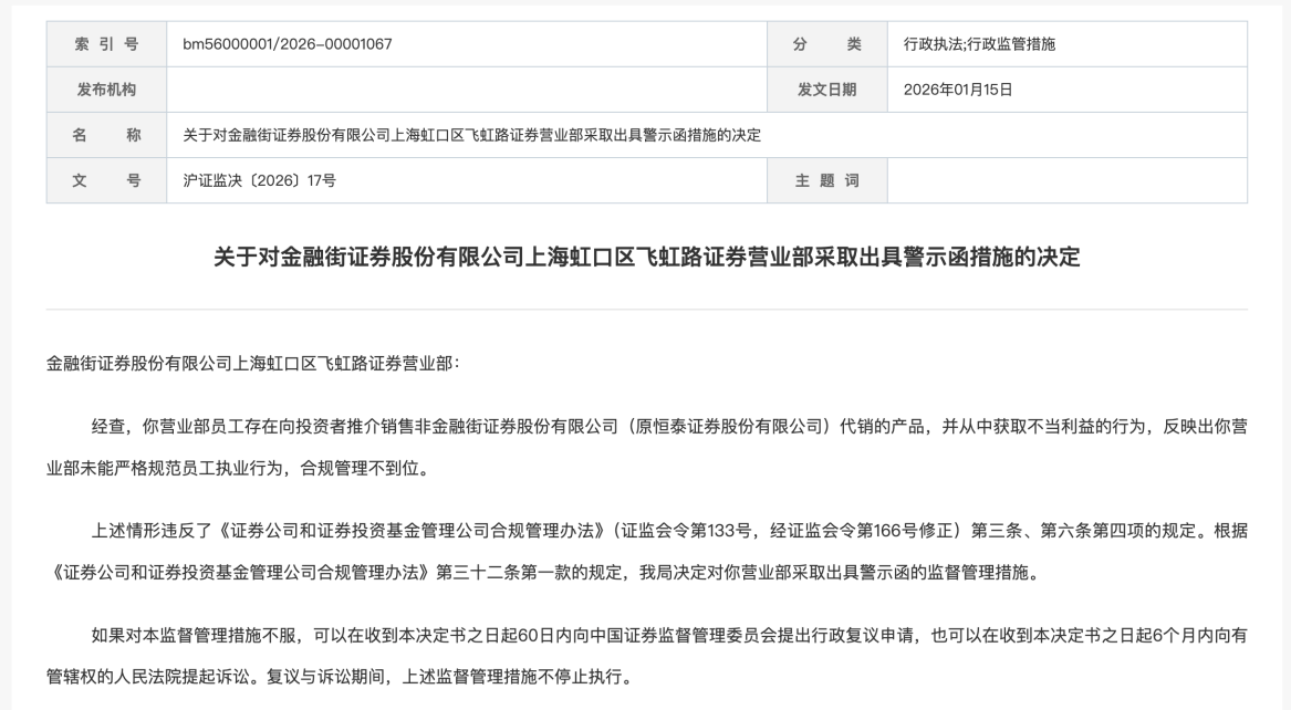2025年12月31日,內蒙古自治區(qū)證監(jiān)局、廣東省證監(jiān)局就金融街證券合規(guī)問題同步發(fā)布警示函。