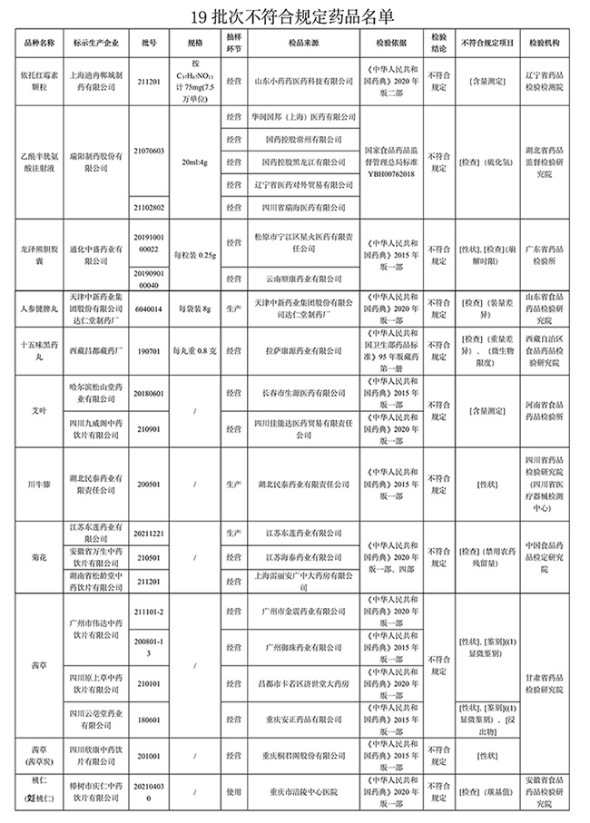 國家藥監(jiān)局表示,對上述不符合規(guī)定藥品,藥品監(jiān)督管理部門已要求相關(guān)企業(yè)和單位采取暫停銷售使用、召回等風(fēng)險控制措施,對不符合規(guī)定原因開展調(diào)查并切實進(jìn)行整改。