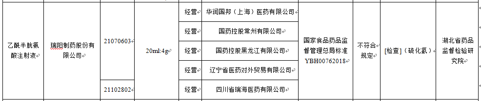 通告顯示,經(jīng)湖北省藥品監(jiān)督檢驗(yàn)研究院檢驗(yàn),標(biāo)示為瑞陽(yáng)制藥股份有限公司生產(chǎn)的2批次乙酰半胱氨酸注射液(批號(hào):21070603、21102802)不符合規(guī)定,不符合規(guī)定項(xiàng)目為硫化氫。