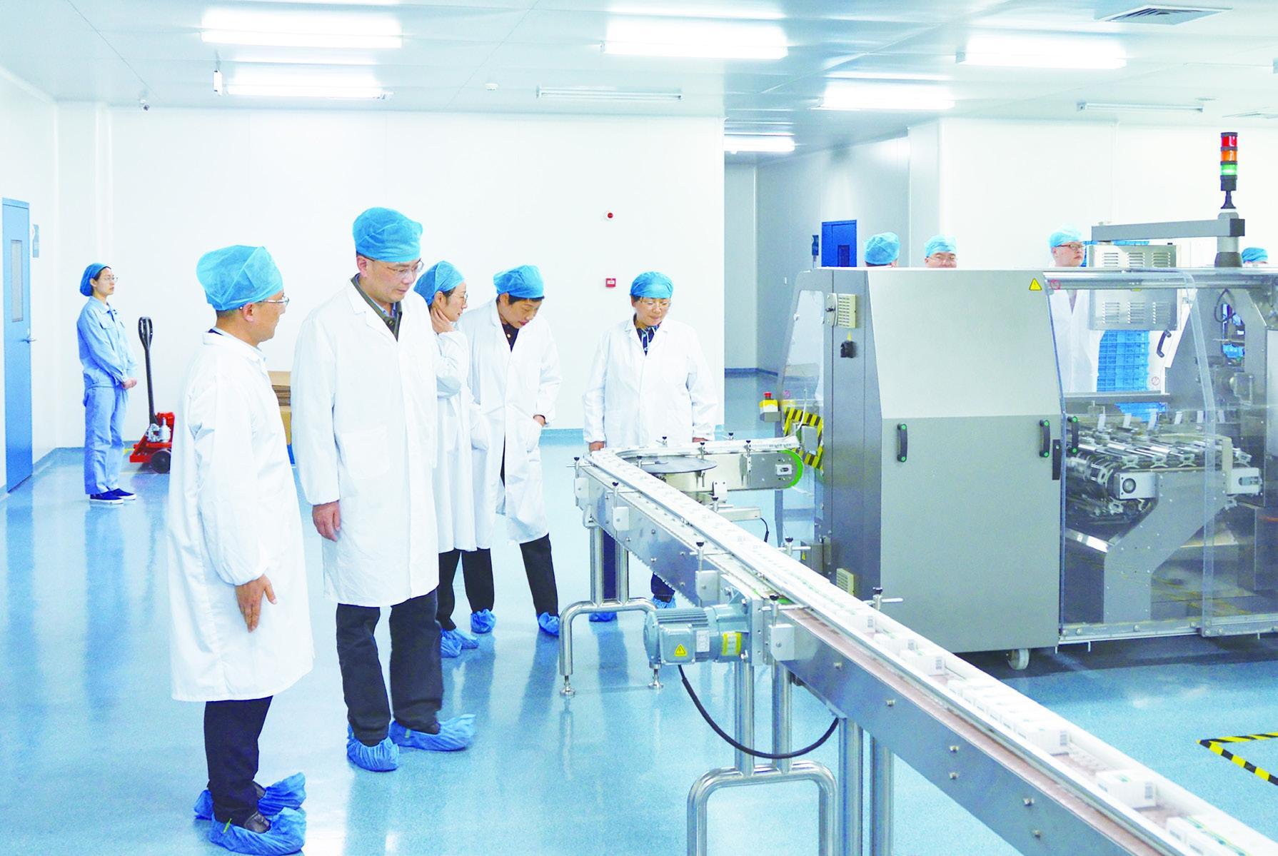 圖為該局調(diào)研組在一家藥品企業(yè)車間了解藥品生產(chǎn)質(zhì)量管理情況。