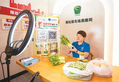 一名主播在浙江省瑞安市玉海街道周松菜市場(chǎng)網(wǎng)絡(luò)直播間銷售農(nóng)產(chǎn)品。孫凜攝(人民圖片)