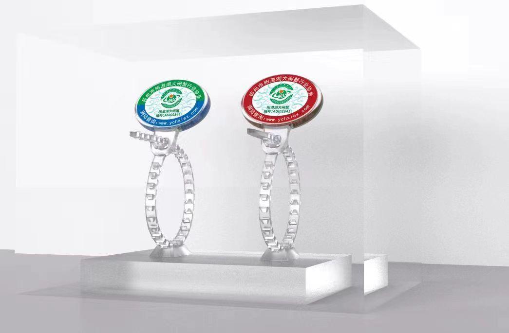 協(xié)會根據養(yǎng)殖戶的養(yǎng)殖面積,按照大閘蟹成熟度分批次發(fā)放防偽蟹扣。2022年版陽澄湖大閘蟹農產品地理標志防偽專用標識分為兩種,一種是深紅色,代表陽澄湖湖區(qū)的大閘蟹;另一種是綠色加藍色,代表高標準養(yǎng)殖池塘的大閘蟹。通過顏色,消費者很容易辨別蟹的產地。