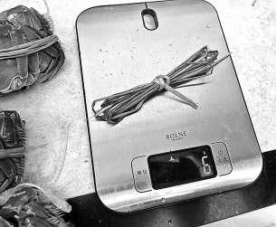 記者對(duì)螃蟹捆扎繩稱(chēng)重。 施本允/攝
