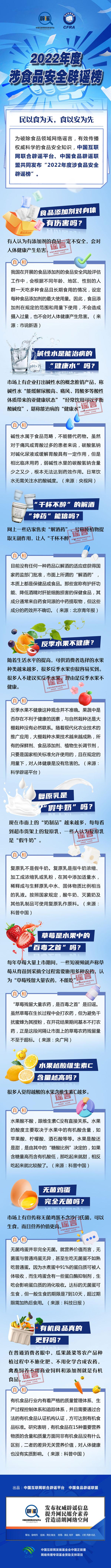 民以食為天,食以安為先。食品安全關系到人民群眾的身體健康和生命安全,受到全社會高度關注。為破除食品領域網(wǎng)絡謠言,有效傳播權威科學的食品安全知識,中國互聯(lián)網(wǎng)聯(lián)合辟謠平臺、中國食品辟謠聯(lián)盟共同發(fā)布“2022年度涉食品安全辟謠榜”,讓我們一起對食品安全謠言說不!