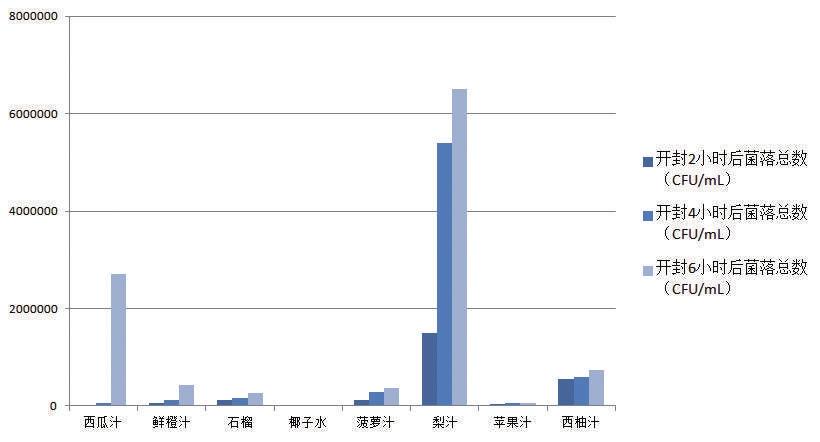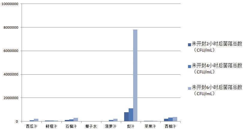 以鮮水果壓榨工藝制作的果汁,即鮮榨果汁,在開封喝過2小時后,有的菌落總數(shù)已經(jīng)超過國家標(biāo)準(zhǔn)規(guī)定限量,最高的一款梨汁達(dá)到了1500000CFU/ mL。其余未超過限量的鮮榨果汁,其菌落總數(shù)也隨著時間大量繁殖。開封喝過4小時、6小時后,大部分鮮榨果汁的菌落總數(shù)超過了國家標(biāo)準(zhǔn)規(guī)定限量的范圍,增長速度最快的一款西瓜汁在開封6小時后菌落總數(shù)與開封2小時數(shù)據(jù)相比增長了近586倍。