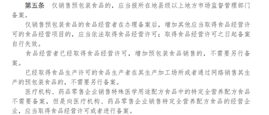 《辦法》規(guī)定,僅銷售預(yù)包裝食品,不需要取得食品經(jīng)營許可。特殊食品屬于預(yù)包裝食品,作為經(jīng)營戶,如果銷售包括特殊食品在內(nèi)的預(yù)包裝食品,那么需要格外關(guān)注《辦法》的第五條、第六章。作為僅銷售預(yù)包裝食品備案的專門條款和章節(jié),它們明確了備案范圍、備案主體資質(zhì)要求和備案信息公示等內(nèi)容。