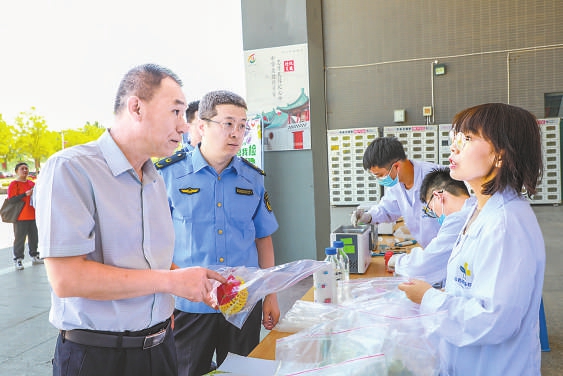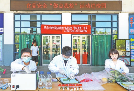 “您好,我們可以自己選擇檢測食品嗎?”6月21日,在太原學院餐廳門前,很多大學生圍在山西綜改區(qū)市場監(jiān)管局設(shè)立的“你點我檢”桌前向工作人員提問。該局食品監(jiān)管科副科長吳煒耐心給學生們講解:“沒問題,咱們掃碼后可以根據(jù)需求選擇,我們會根據(jù)大家的選擇進行相關(guān)檢測?!睅孜粚W生在吳煒的引導下進行了操作,同時觀看了食品安全快檢流程?!拔覀兊牟妥谰涂磕銈儽O(jiān)督,必須給你們點贊!”幾位同學對市場監(jiān)管部門的工作表示贊揚。