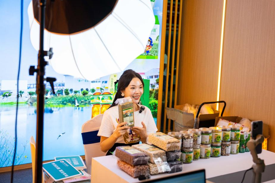 9月15日,在長(zhǎng)沙國(guó)際會(huì)展中心,參展商通過(guò)直播推銷雜糧。