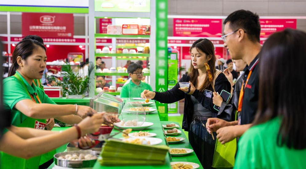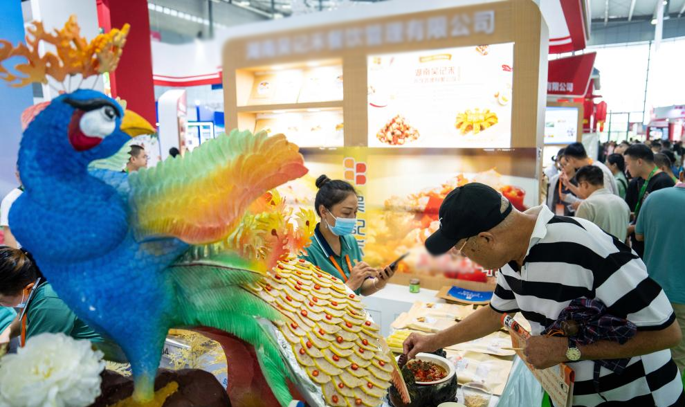 9月15日,在長(zhǎng)沙國(guó)際會(huì)展中心,觀眾在品嘗小吃。