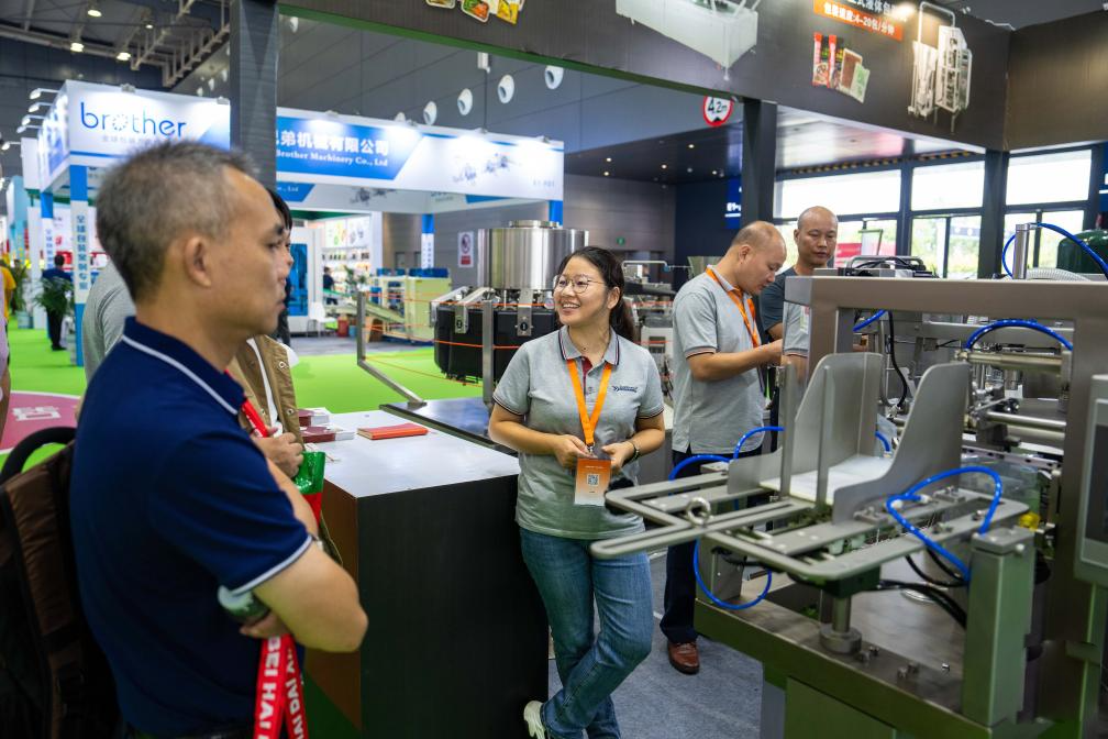 9月15日,在長(zhǎng)沙國(guó)際會(huì)展中心,參展商(中)向觀眾介紹食品包裝設(shè)備。
