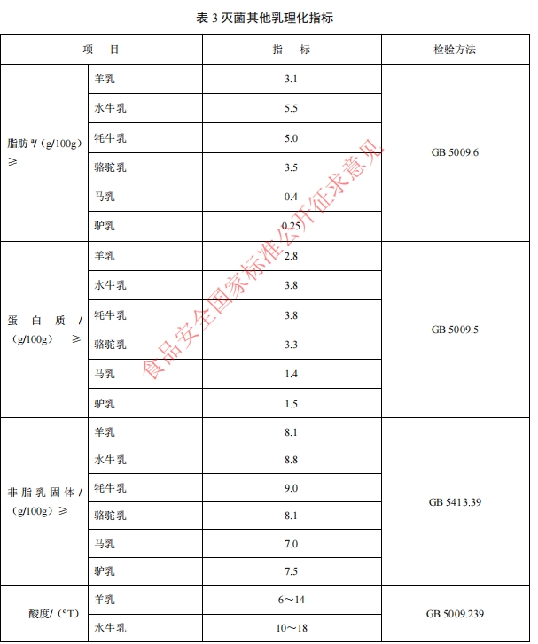 此次修訂還調(diào)整了理化指標(biāo)和微生物限量要求,如巴氏殺菌牛乳的酸度下限調(diào)整為10oT;巴氏殺菌羊乳的酸度上限調(diào)整為14oT;增加了水牛乳、牦牛乳、駱駝乳、驢乳和馬乳的脂肪、蛋白質(zhì)、非脂乳固體、酸度等理化指標(biāo)的要求,如在蛋白質(zhì)含量(g/100g)方面,指標(biāo)與常溫奶要求一致。